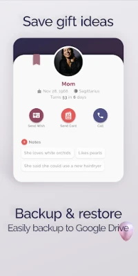 ๐ Save Gift Ideas: Keep track of gift ideas for your loved ones with Birthday Reminder & Calendar. This feature allows you to save gift ideas for each person in your contact list. This way, you can easily refer back to the list when it's time to buy a gift. It also helps you keep track of what you've already given to someone, so you don't accidentally repeat a gift.